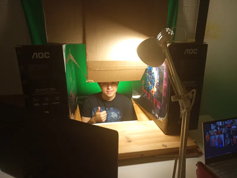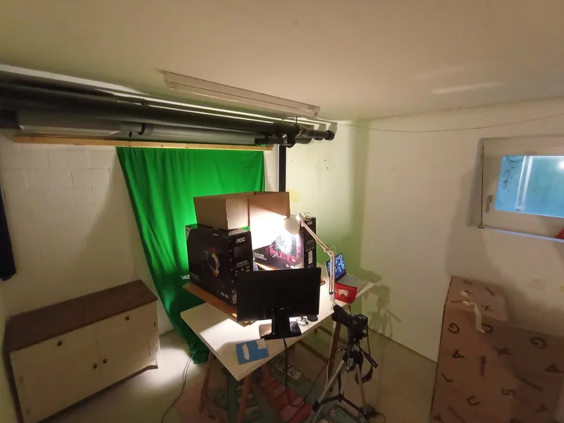 My friend and I filmed all the footage in my basement. We hung up a green screen in the back and constructed a “helmet” with cardboard. The green screen was just a big green cloth which we hung up on a pipe.