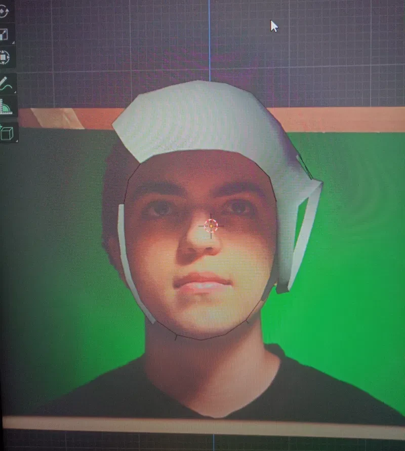 First I chroma keyed the green screen. This proces worked better than I predicted which was a nice surprise. Then I removed the boxes and other things that were not my friends head. The keyed video was exported and put on a plane in blender. This plane was planted inside the helmet and then I added some lights and other things to make the scene look better.